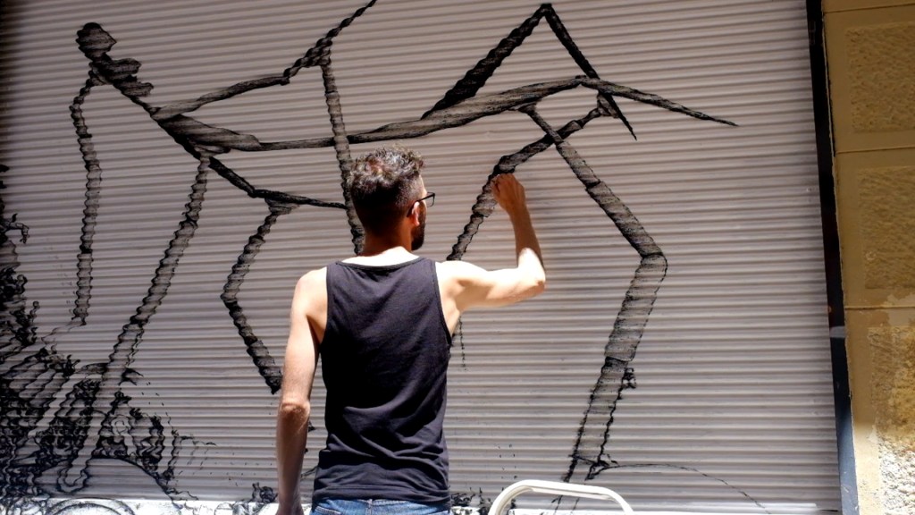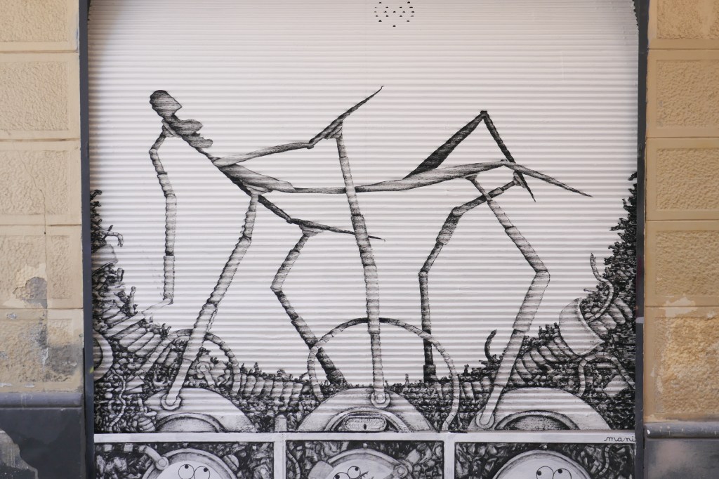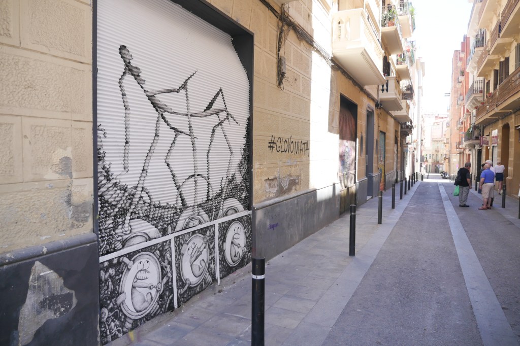 Cette fresque est un projet un peu particulier de part son support. Elle a été réalisée sur une persiana dans le centre de Gracia, à Barcelone. Il s’agissait de transformer un vieux rideau de fer rouillé en une œuvre d’art dynamique, je trouvais ce défi passionnant.