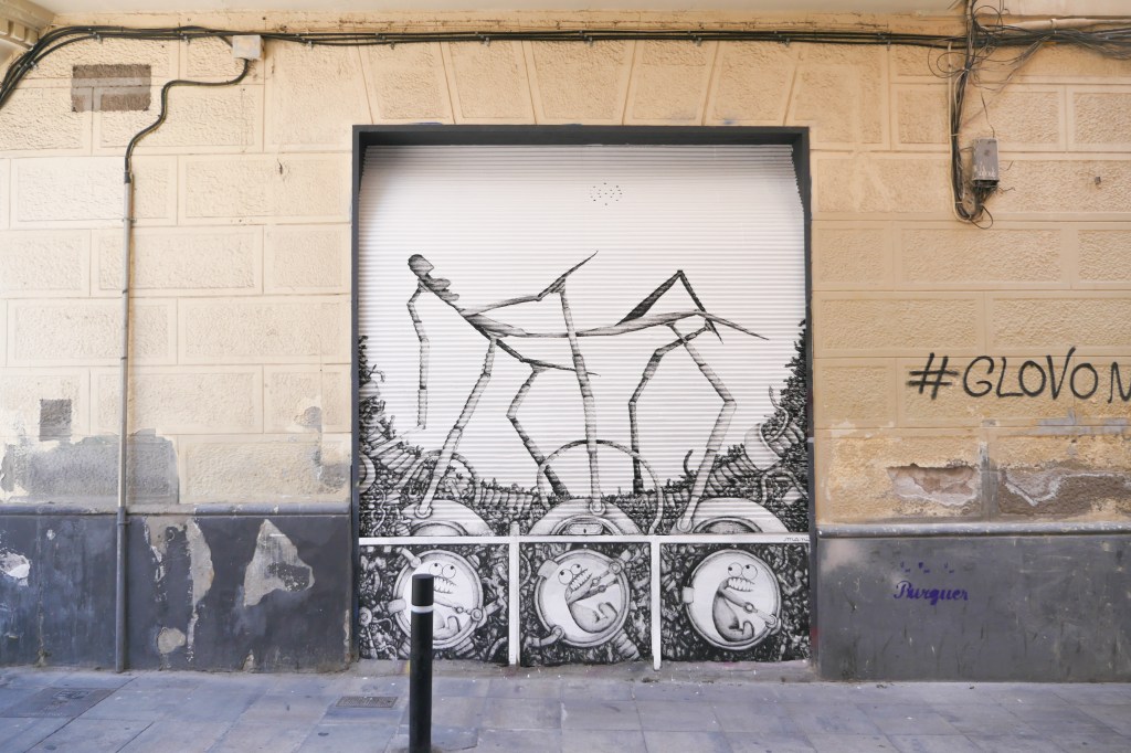 This fresco is a bit special because of its support. It was performed on a persiana in the center of Gracia, Barcelona. It was about transforming an old rusty iron curtain into a dynamic work of art, I found this challenge exciting.
