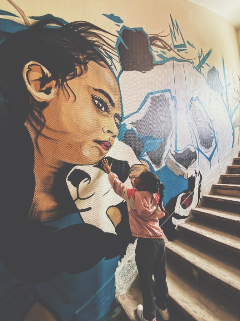 This piece is close to my heart because it represents my daughter with a Panda. The place in which it was made is an atypical place in the center of Lyon (FRANCE) which was carried out in an old building of an emblematic French brand, of 4000 square meters.