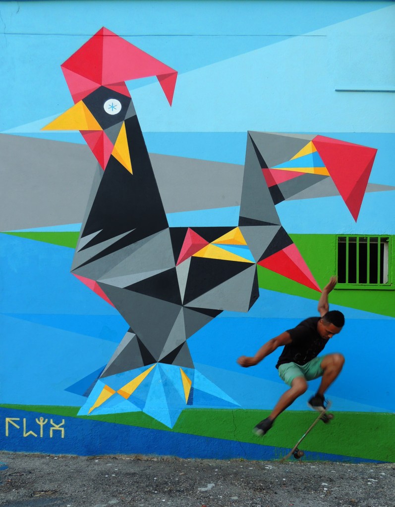 With this piece I wanted to communicate the union of my country Venezuela with the country that invited me, Portugal. Since there are ties that unite us due to migrations of Portuguese to Venezuela during the 50s and 60s looking for better living conditions. This piece is represented by a large geometric background that covers the buildings, on which are two symbolic birds of each country that are in the air.