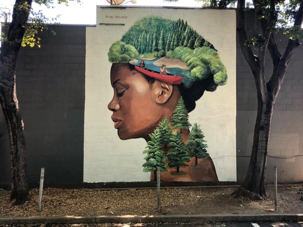 The piece is located in a simple car park, with not even a good view from the street, when I started making it I felt a bit frustrated because of the place where it was thought I really like the wall. Then while I was painting I realized all the movement of this place, and the fact that everyone was parking became a positive thing, because they stop and talk to me and everyone was really surprise and I received great feedback. Also there where a lot of homeless is this area and they were really happy about the mural and felt represented, what I live most of public art is that is for everyone, no just for minorities.