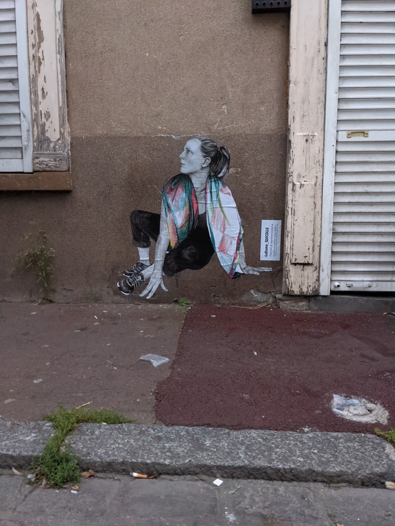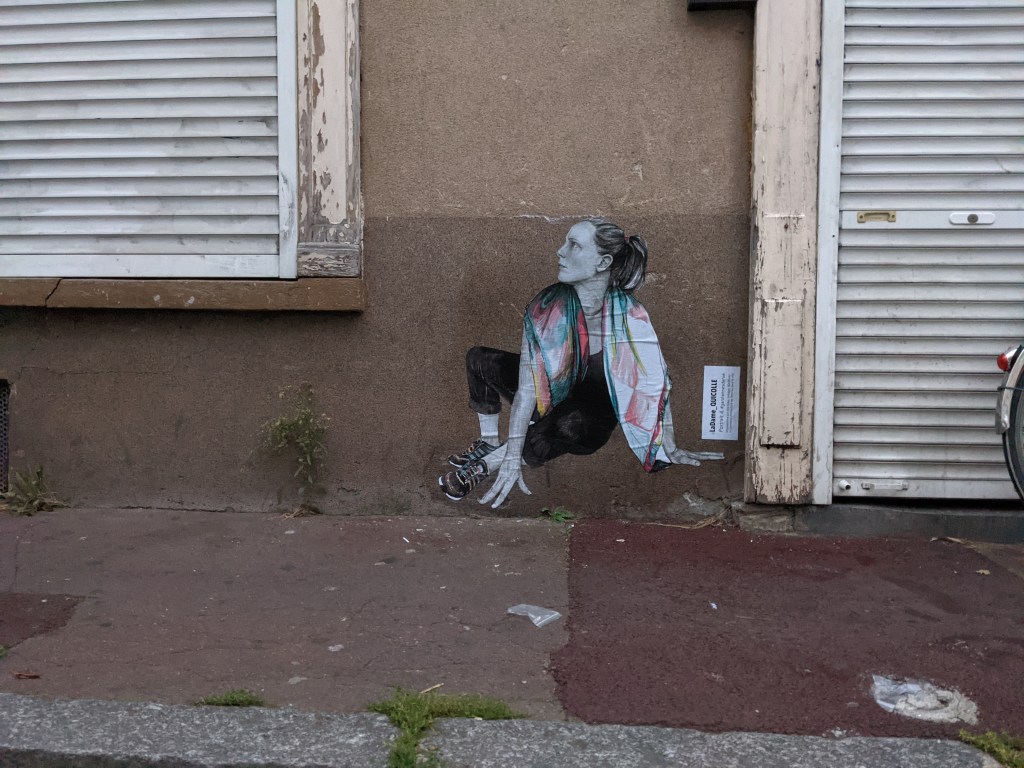 I chose the 4 # portrait. Drawing of a woman who falls and seems to get up. It is human-sized, it marks the existence of a woman in this place, in this street. It is a trompe l’oeil of reality. My job is to make people believe that the person is there and exists at that moment.