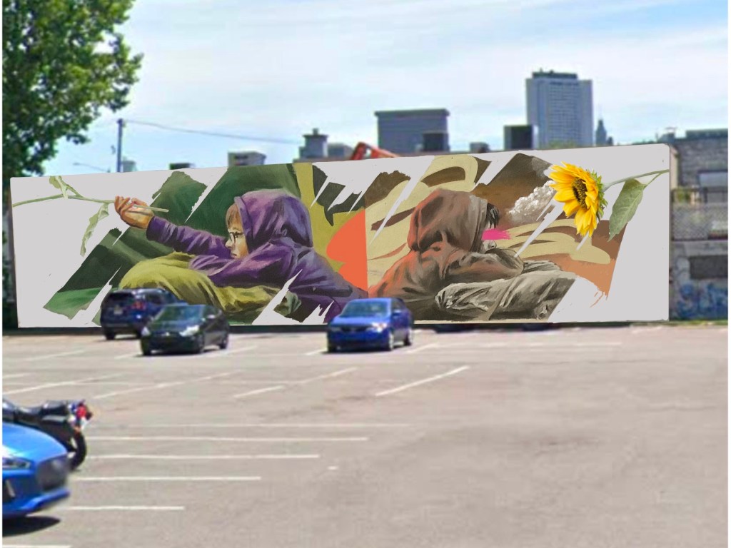 Cette fresque sera réalisée par l’artiste Deco’Real. L’artiste explique ainsi sa démarche : « Cette murale reflète ma vision de la santé mentale chez l’enfant. Deux parties d’un même enfant, sa part gaie, joyeuse, solaire et pleine d’espoir et son autre partie plus sombre, plus éteinte, plus complexe. Ce qui explique que la partie de gauche soit orientée sur des couleurs assez vives et la partie de droite sur des couleurs plus sombres. Le côté joyeux de l’enfant tend vers son côté sombre une fleur de tournesol, pour lui amener de l’espoir et de la lumière, une main tendue vers lui. Les deux enfants sont appuyés sur un coussin pour un côté rassurant lié au lit, au sommeil. Le regard d’un des enfants est masquée par un coup de peinture rose, signe de son manque d’envie de voir le beau, de voir la lumière et l’espoir.»