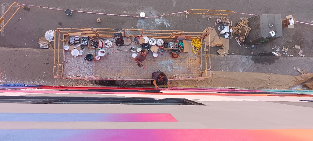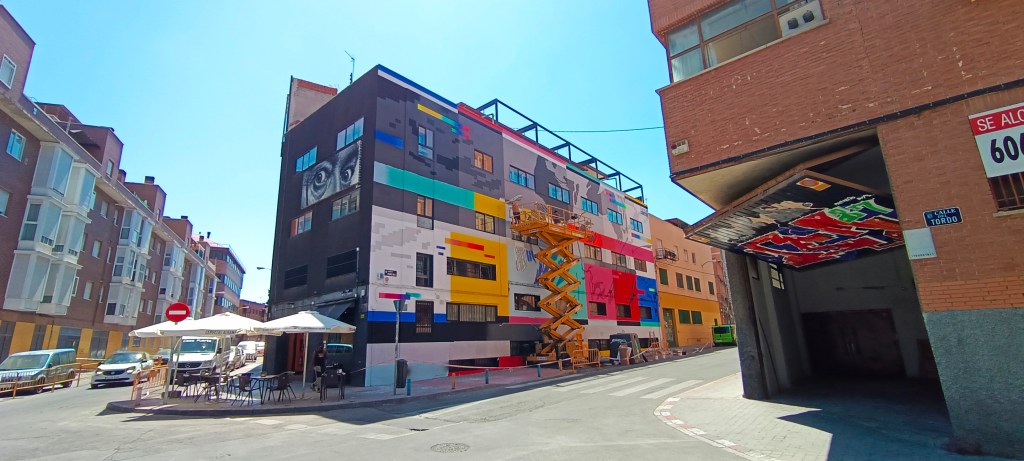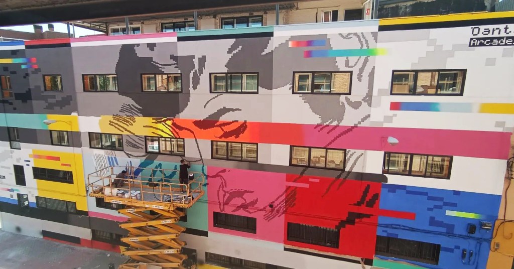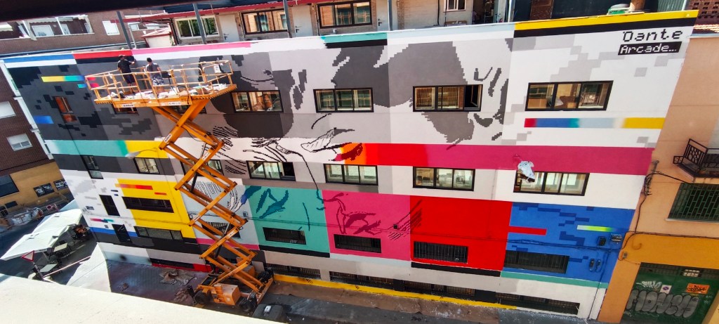 This work expresses the idealization of romantic love through a vintage comic scene, with the protagonists represented based on pixels, as if it were an arcade video game or the zoom of a low quality image, from an old computer. or game console. Inspired by the colors of the fit chart. Television test signal that is usually broadcast in the absence of programming. And also with failures, or Glitch as they are called in the field of computing or video games. It also refers to the virtual space and the overstimulation that it exerts on us more and more every day and affects our human relationships in our society. This work encourages us to reflect on our identity and question whether we live. Large format mural in Carabanchel Madrid! (32×12)