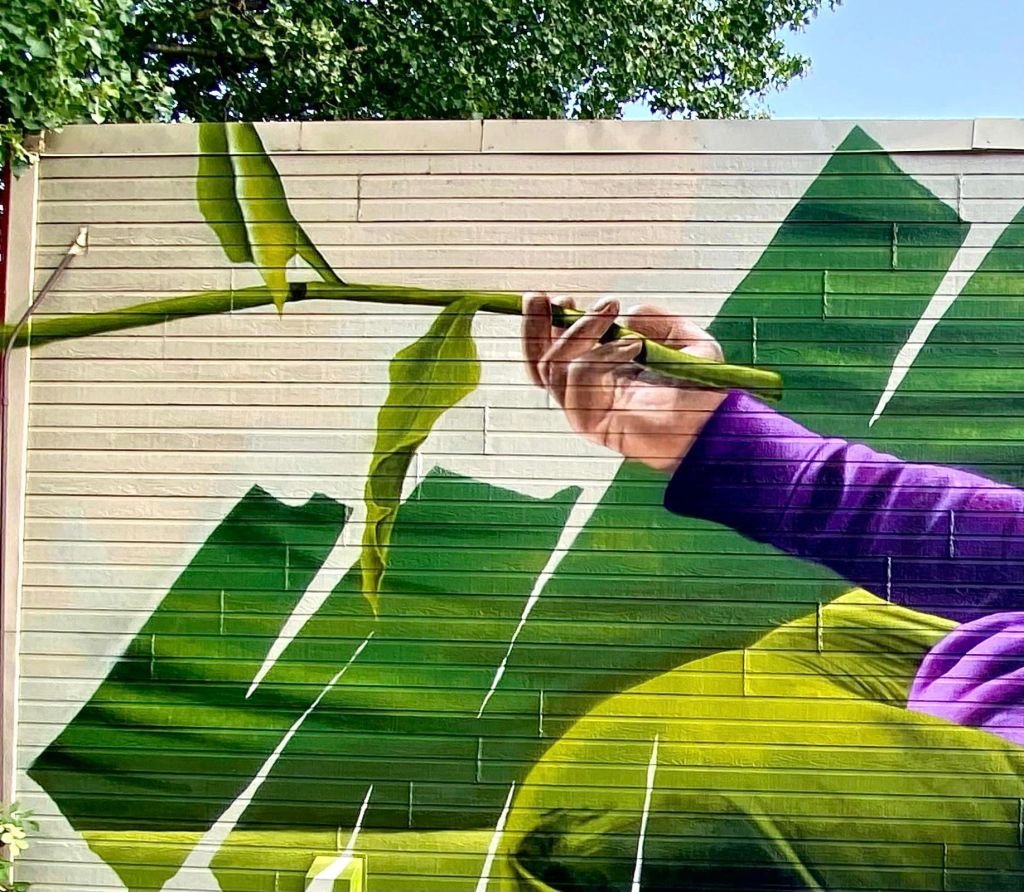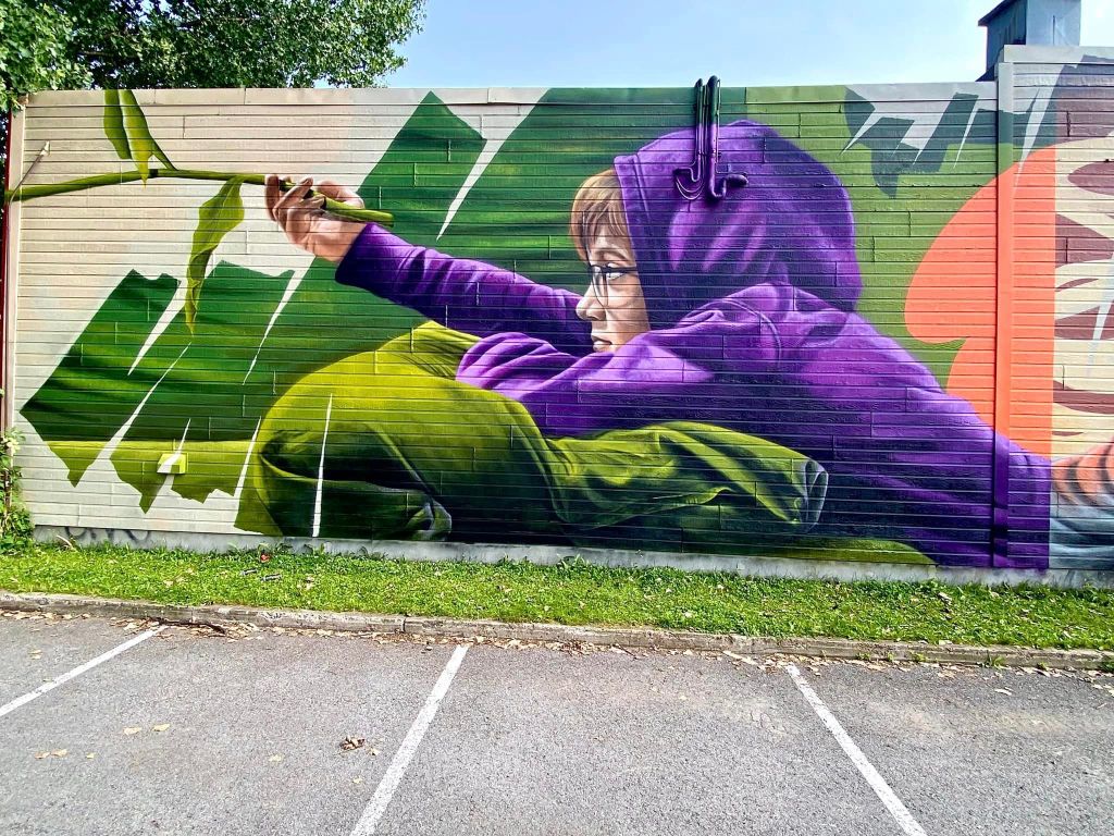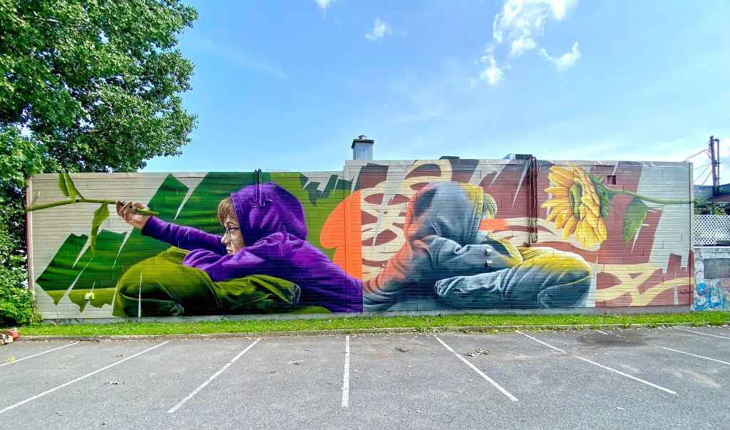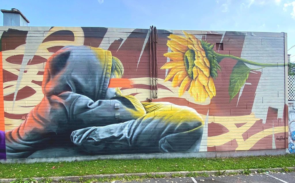 The artist explains his approach as follows: «This mural reflects my vision of children’s mental health. There are two parts to the same child: the cheerful, joyful, sunny and hopeful part and the darker, duller, more complex part. This explains why the left-hand side is oriented towards fairly bright colours and the right-hand side towards darker colours. The happy side of the child is holding out a sunflower towards his darker side, to bring him hope and light, a hand outstretched towards him. The two children are leaning on a cushion, to reassure them that they are in bed and asleep. The eyes of one of the children are masked by a coat of pink paint, a sign of his lack of desire to see beauty, light and hope.