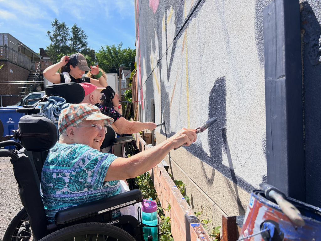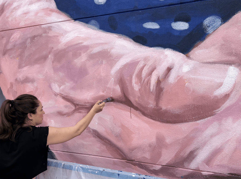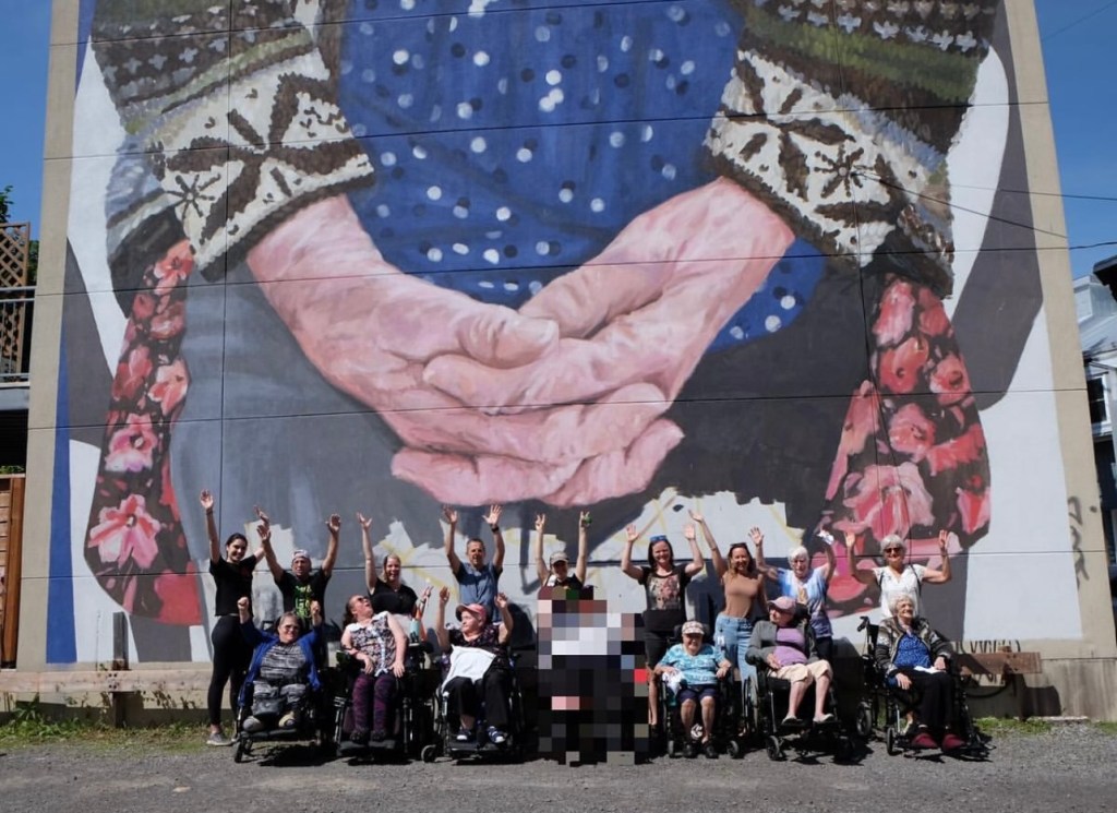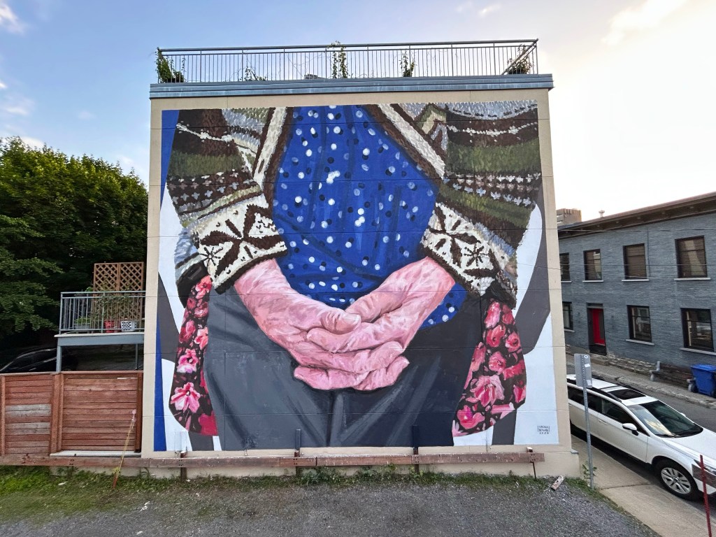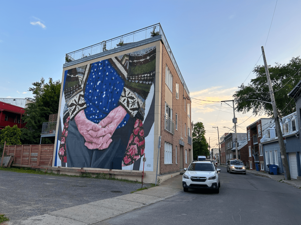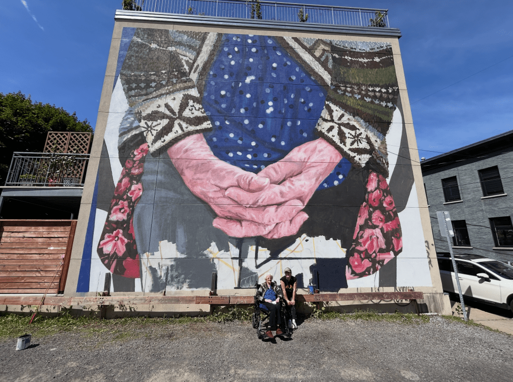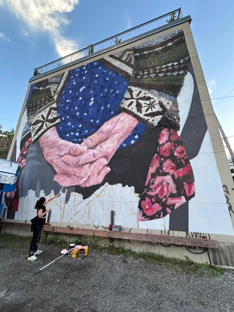 A project that began in early 2024 and has been completed in June 2025. This project is a special collaboration with the residents of the CHSLD Saint-Jean-Eudes and CHSLD d’Assise centers. Through painting workshops and interactions with the residents of both centers, Virginia has been inspired by their experiences, fabrics and skin as well as the urban space to paint the mural and keep a piece of our memory.
